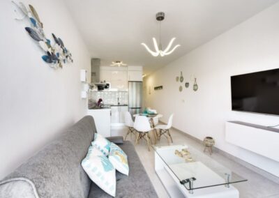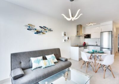 - El apartamento viene con una cocina totalmente equipada con todo lo necesario para hacer cómoda la estancia de los huéspedes, dispone de vitrocerámica, frigorífico, horno, microondas, tostadora, hervidor, plancha y lavadora.